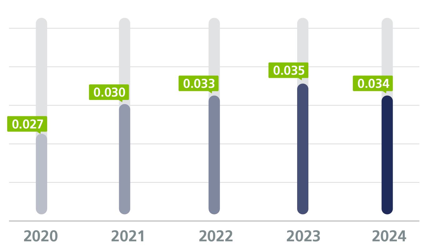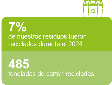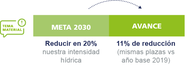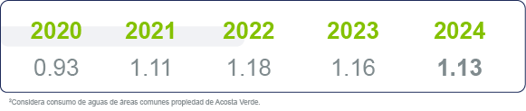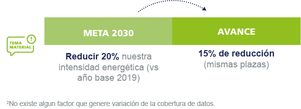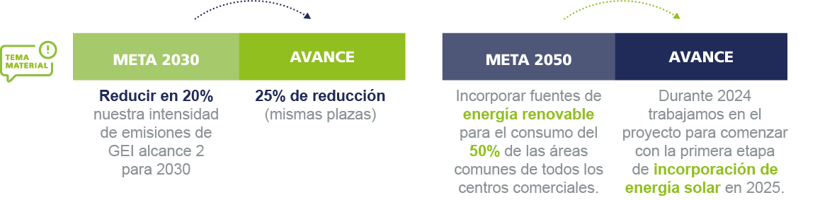 Para llegar al cumplimiento de esta meta hemos implementado diversas iniciativas como instalación de iluminación LED en las áreas comunes del portafolio, tecnología de solatubes, renovación de equipos de refrigeración para operación de aire acondicionado, entre otros. Continuaremos realizando esfuerzos en los siguientes años, en búsqueda de alcanzar nuestra meta de reducción de 20% en intensidad energética.